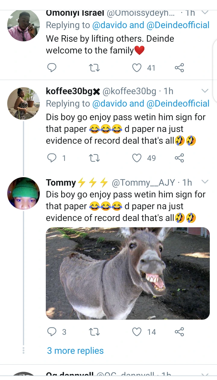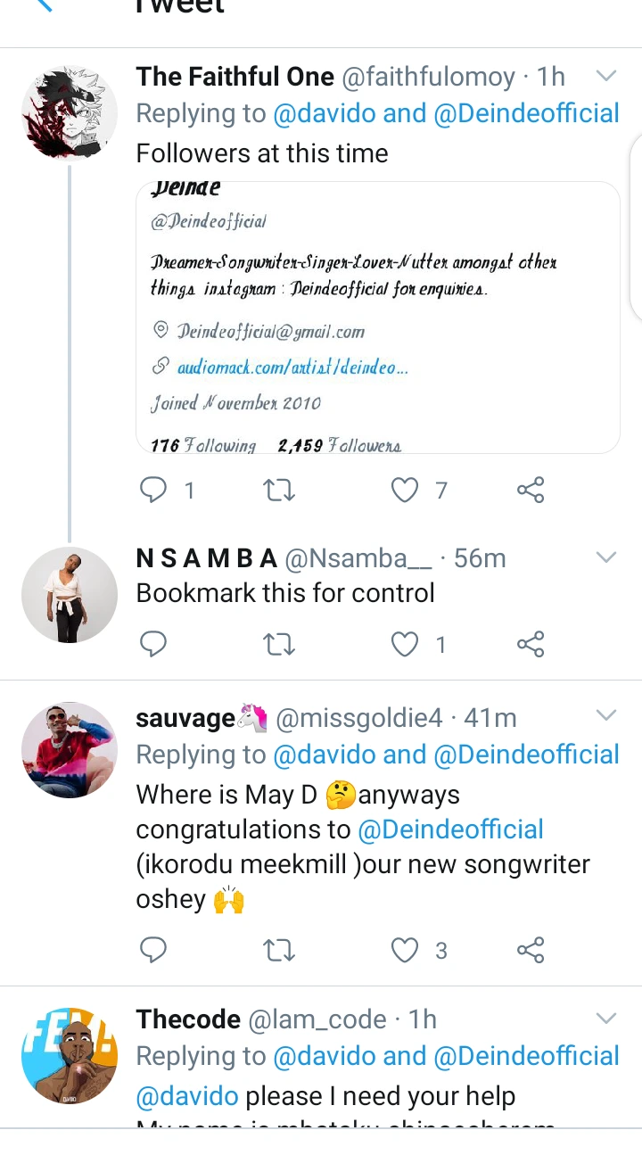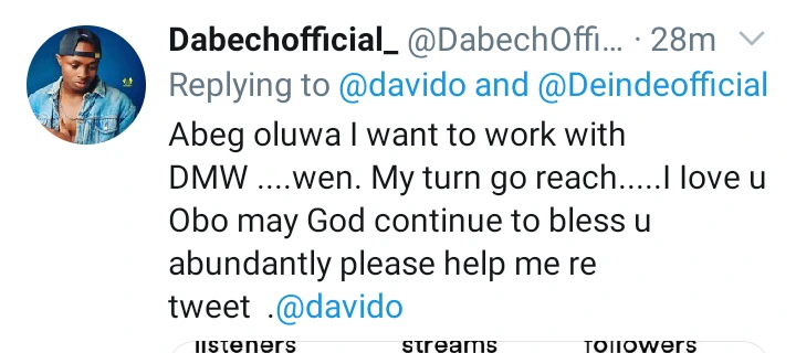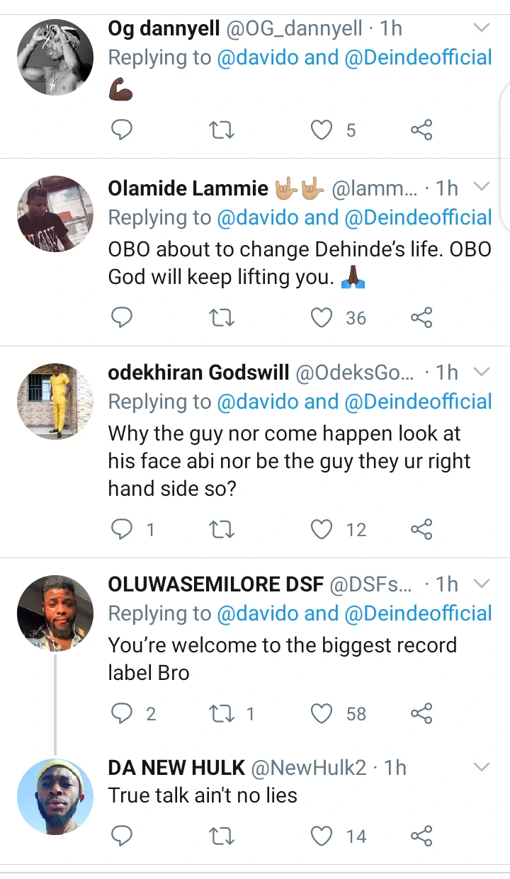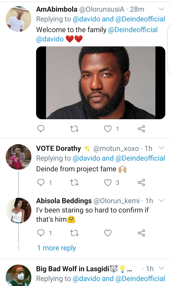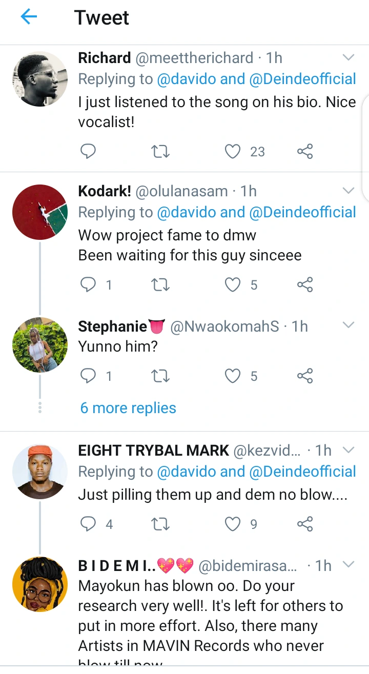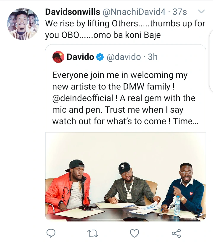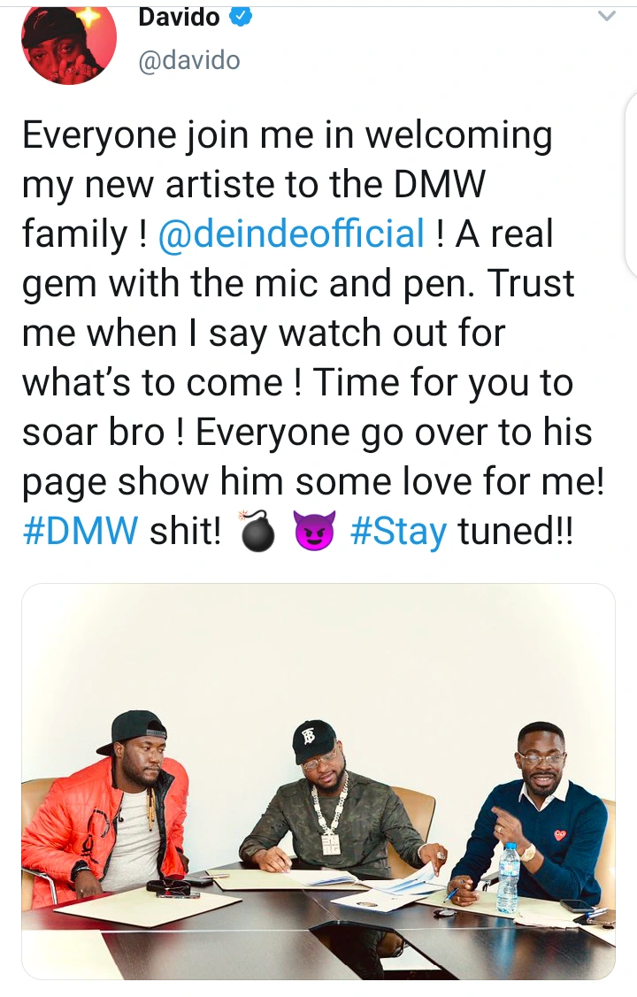 According to Davido's tweets, he welcomed Deinde into the DMW'S family saying he is very talented and Nigerians should watch out for him. Having seen the likes of Peruzzi, Dremo, Mayorkun And many others succed under the DMW Family, we should definitely be expecting something unique from him.